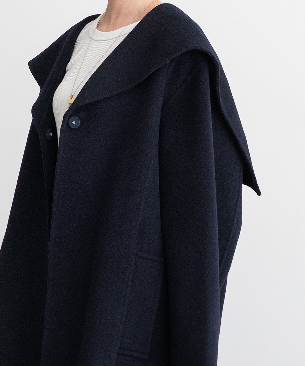 後ろに大きく広がる四角いセーラーカラーが印象的。前はすっきりとしたV開きで首元を美しく見せます。大きな襟は重たくなりがちですが、軽量のダブルフェイス素材を採用することで軽やかに仕上げました。大きめの襟のラインは体型カバーにもなり、華奢な印象を与えてくれます。